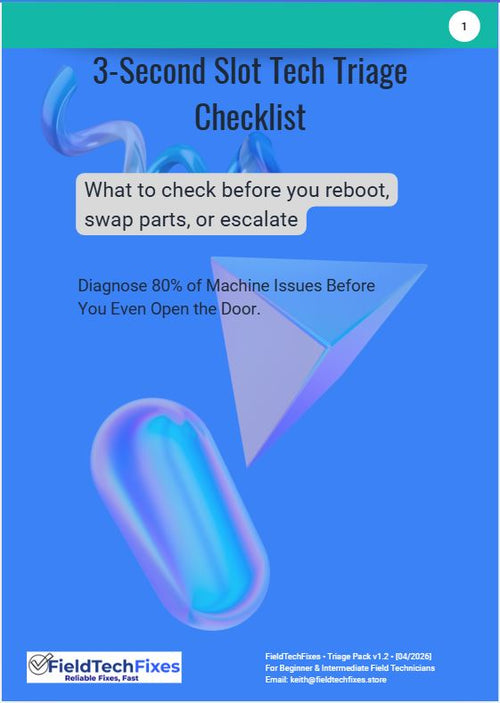 ✅ 3-Second Slot Machine Triage Checklist (v1.2) ✅ Triage Decision Flow — fix now, monitor, or escalate ✅ Common False Failures — what looks bad but isn't ✅ Do Not Replace First — diagnose before you swap ✅ BONUS: The Never-First List ✅ BONUS: Player Comm Cards — 10 real scenarios, word for word